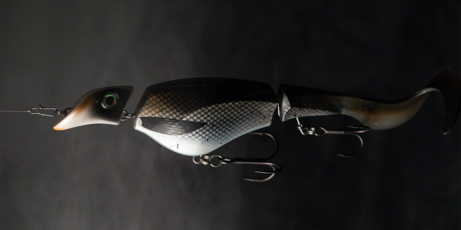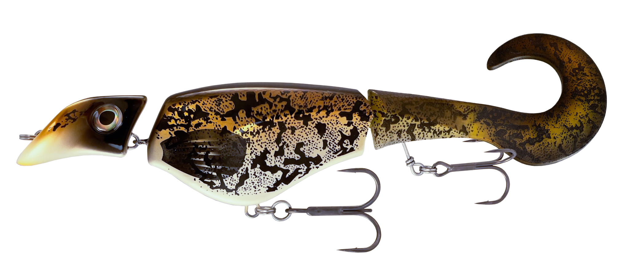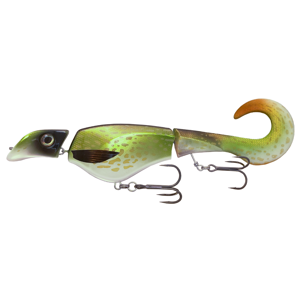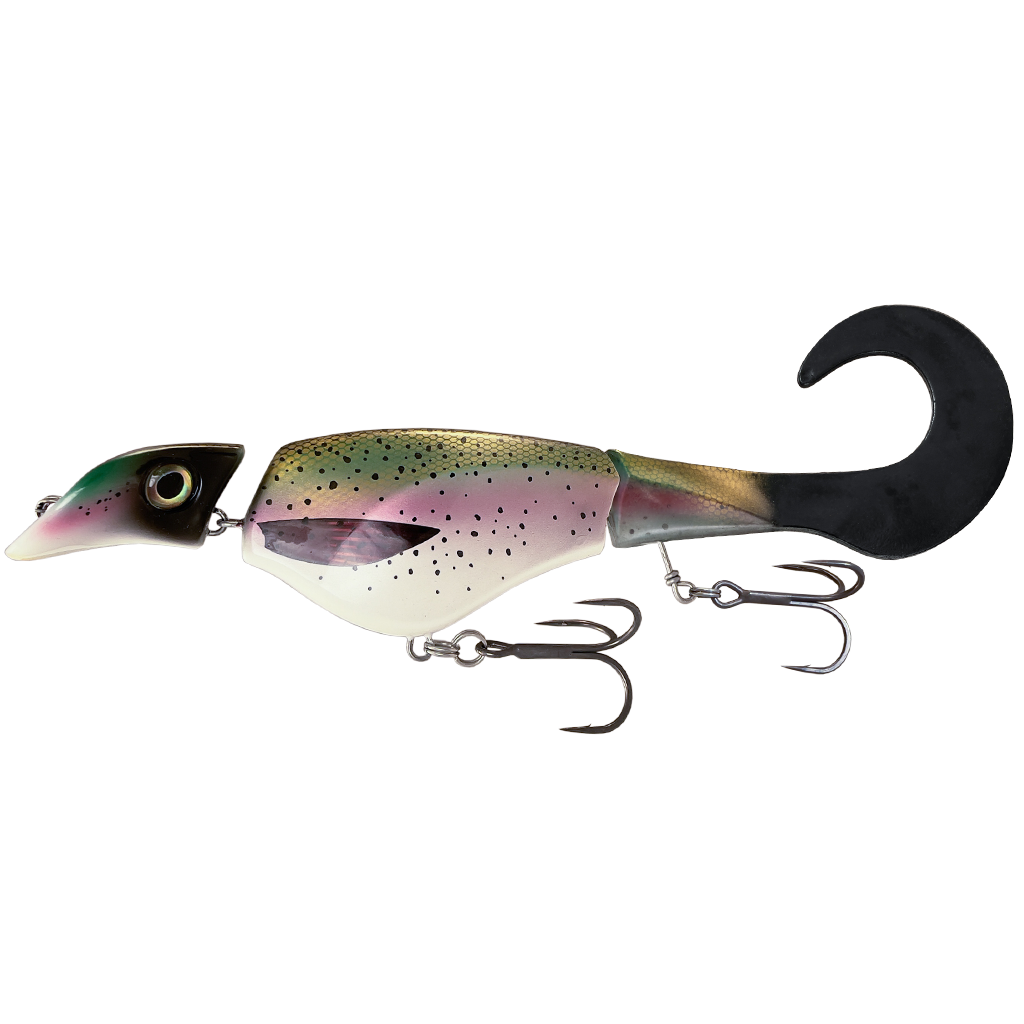 The Colossus Curly features realistic eyes, a fixed tail joint and a large head that displaces so much water that no predator can miss it. Equipped with very strong and super sharp premium BKK hooks and double split rings under the belly that prevents the fish from breaking loose.